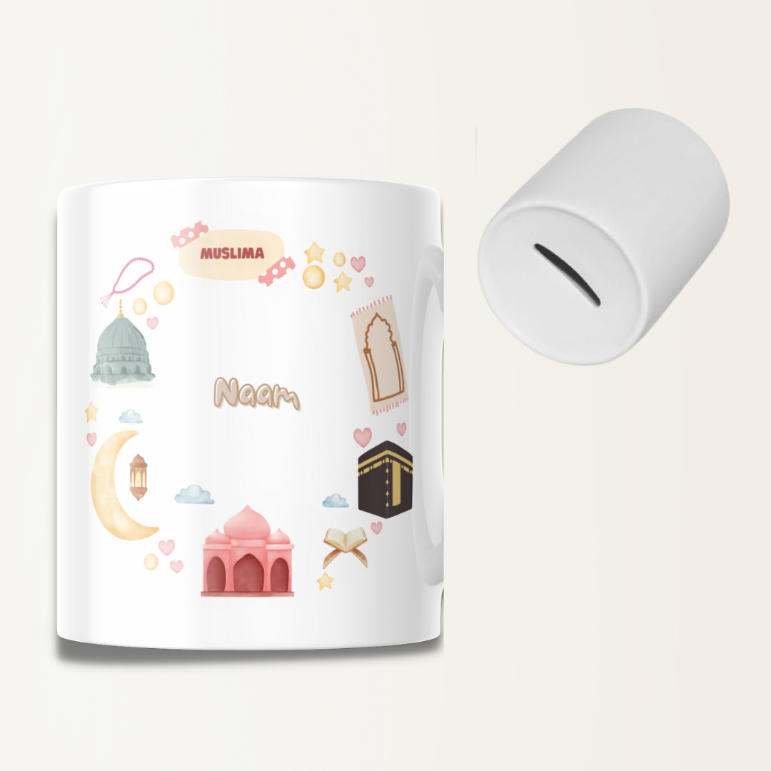 Het spaarpotje is bedrukt met een vrolijk islamitisch thema en kan zelfs gepersonaliseerd worden met de naam van het kind. Zo wordt sparen nóg leuker en voelt het echt als een speciaal cadeau. Dankzij het handige dopje aan de onderzijde kan het spaargeld eenvoudig worden geleegd.