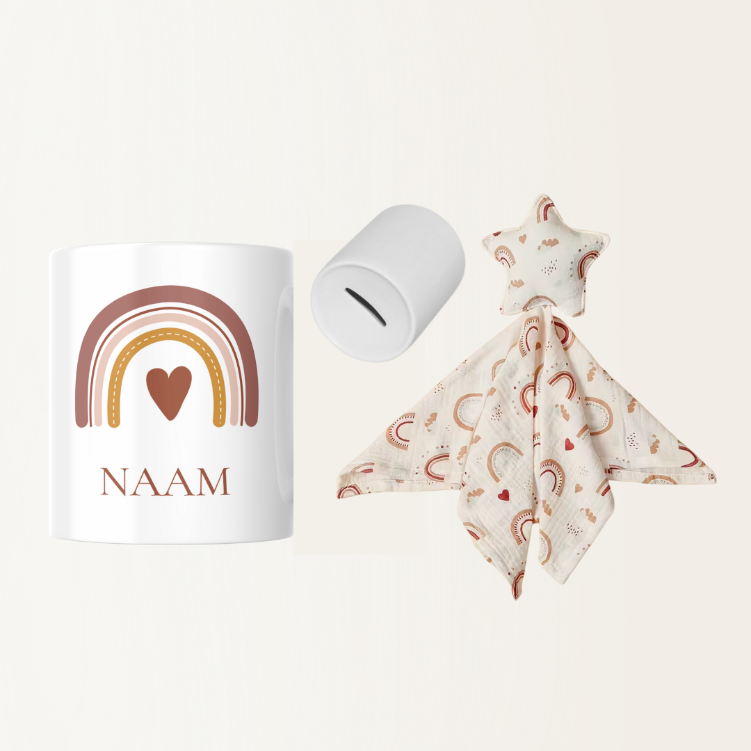 Set - Spaarpot met naam - Hydrofiele knuffeldoekje met ster - Regenboog