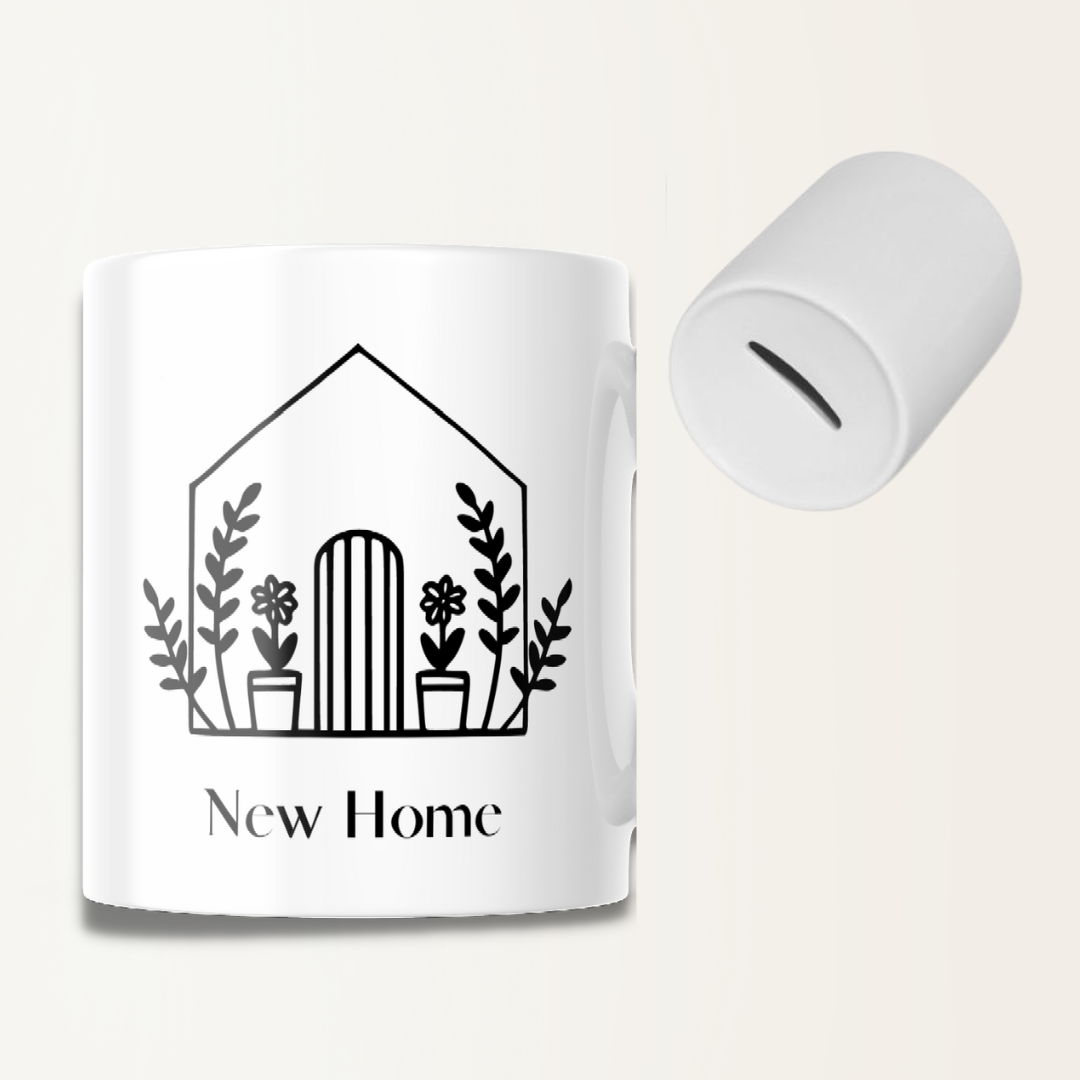De keramische spaarpot heeft een strak en modern ontwerp en is bedrukt met een passend nieuw-huis thema. Perfect om te sparen voor een nieuwe bank, lamp, eettafel of gewoon om alvast een potje aan te leggen voor de inrichting.